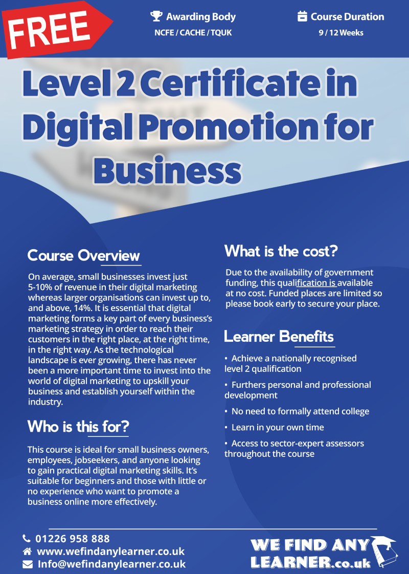 Upon completion, learners will achieve a nationally recognised Level 2 qualification, providing clear evidence of their knowledge and skills in digital promotion. This qualification can support career progression, further study, or entry into roles where digital and business awareness is essential.